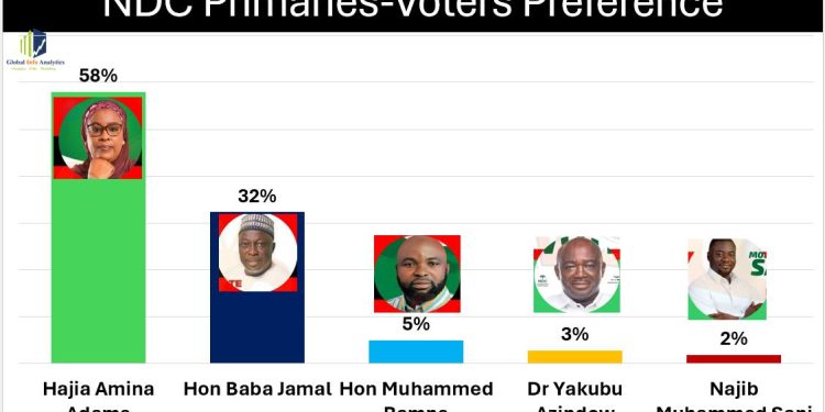 The survey indicates that 58% of respondents support Hajia Amina Adams, followed by Baba Jamal at 32%. Other aspirants—Muhammed Ramne, Dr. Yakubu Azindow, and Najib Muhammed Sani—received 5%, 3%, and 2%, respectively.